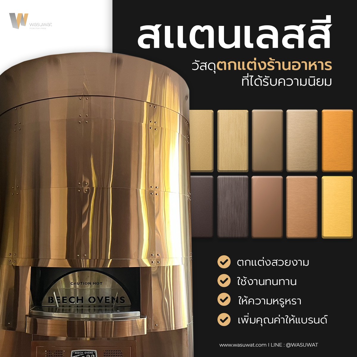 Wasuwat มีผลิตภัณฑ์แผ่นสแตนเลสสีและคิ้วสแตนเลสที่ตอบโจทย์งานดีไซน์ทุกรูปแบบ ทั้งสแตนเลสสีตกแต่งภายในและสแตนเลสสีตกแต่งภายนอก พร้อมบริการออกแบบ ผลิต และติดตั้งโดยช่างที่มีประสบการณ์ ที่สำคัญ คุณยังสามารถเลือกผลิตสแตนเลสตามเฉดสีที่ต้องการได้เพียงมีตัวอย่างให้ทีมช่างของเรา