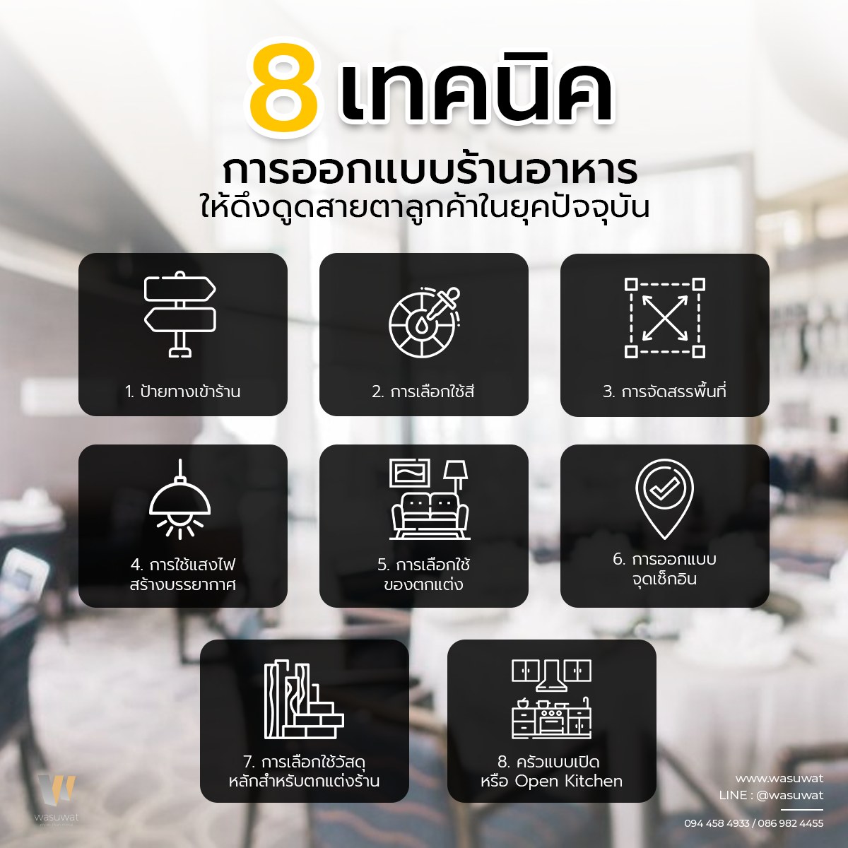การออกแบบตกแต่งร้านอาหารให้สวยงามและมีเอกลักษณ์นั้นสามารถช่วยดึงดูดความสนใจของลูกค้าและกลุ่ม Influencer ให้มาใช้บริการที่ร้านของคุณได้ เริ่มตั้งแต่บรรยากาศหน้าร้าน ที่จอดรถ การตกแต่งภายนอก การจัดสวน การตกแต่งภายใน แสงสี เสียงดนตรี รวมไปถึงการเลือกใช้เครื่องครัว ก็ล้วนแต่สะท้อนเป็นความประทับใจได้ เพราะต้องยอมรับว่ามีลูกค้าหลายกลุ่มที่กลับมาร้านอาหารเดิม ๆ เพราะชอบบรรยากาศและรสชาติของอาหาร หรือเรียกง่าย ๆ ว่าร้านอาหารบางร้านเป็น Comfort Zone นั่นเอง ทาง Wasuwat จึงขอแนะนำเทคนิคการออกแบบร้านอาหารที่ช่วยดึงดูดความสนใจจากลูกค้าและสร้างความประทับใจได้ในคราวเดียวกัน