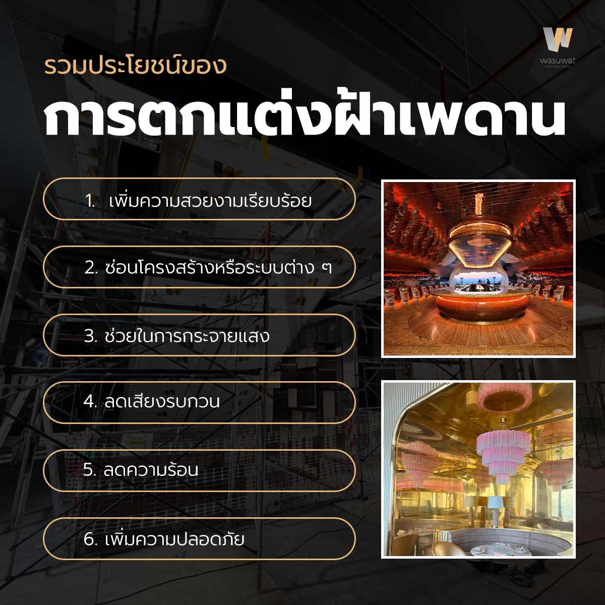ฝ้าเพดานเป็นอีกองค์ประกอบสำคัญของงานดีไซน์ที่ถูกใช้งานเพื่อความสวยงาม และช่วยปกปิดโครงสร้างหรืองานระบบของอาคาร เช่น ระบบไฟฟ้า ท่อน้ำ ท่อระบายอากาศ หรือโครงหลังคา ที่อาจจะทำให้งานดีไซน์ดูไม่เรียบร้อย แต่จริง ๆ แล้วฝ้าเพดานยังมีประโยชน์อื่น ๆ ในลักษณะของการใช้งาน เช่น ช่วยป้องกันความร้อนและเสียงรบกวนจากภายนอก หรือแม้แต่ช่วยเพิ่มความปลอดภัยให้โครงสร้างอาคาร เราจะพาไปดูประโยชน์เพิ่มเติมของการติดตั้งฝ้าเพดาน ดังนี้: