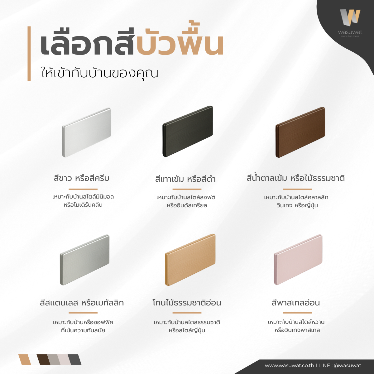 การเลือกสีของบัวพื้นมีผลอย่างมากต่อภาพรวมของการตกแต่งภายในบ้าน หากต้องการให้บ้านดูอบอุ่นสบายตา อาจเลือกใช้บัวพื้นสีขาว ครีม หรือโทนอ่อน ส่วนบ้านสไตล์โมเดิร์นหรืออินดัสเทรียล สีเทาเข้ม ดำ หรือสแตนเลสดูหรูหราจะให้ลุคที่ดูทันสมัย Wasuwat มีเทคนิคการเลือกสีบัวพื้นให้ตอบโจทย์มาฝากกัน