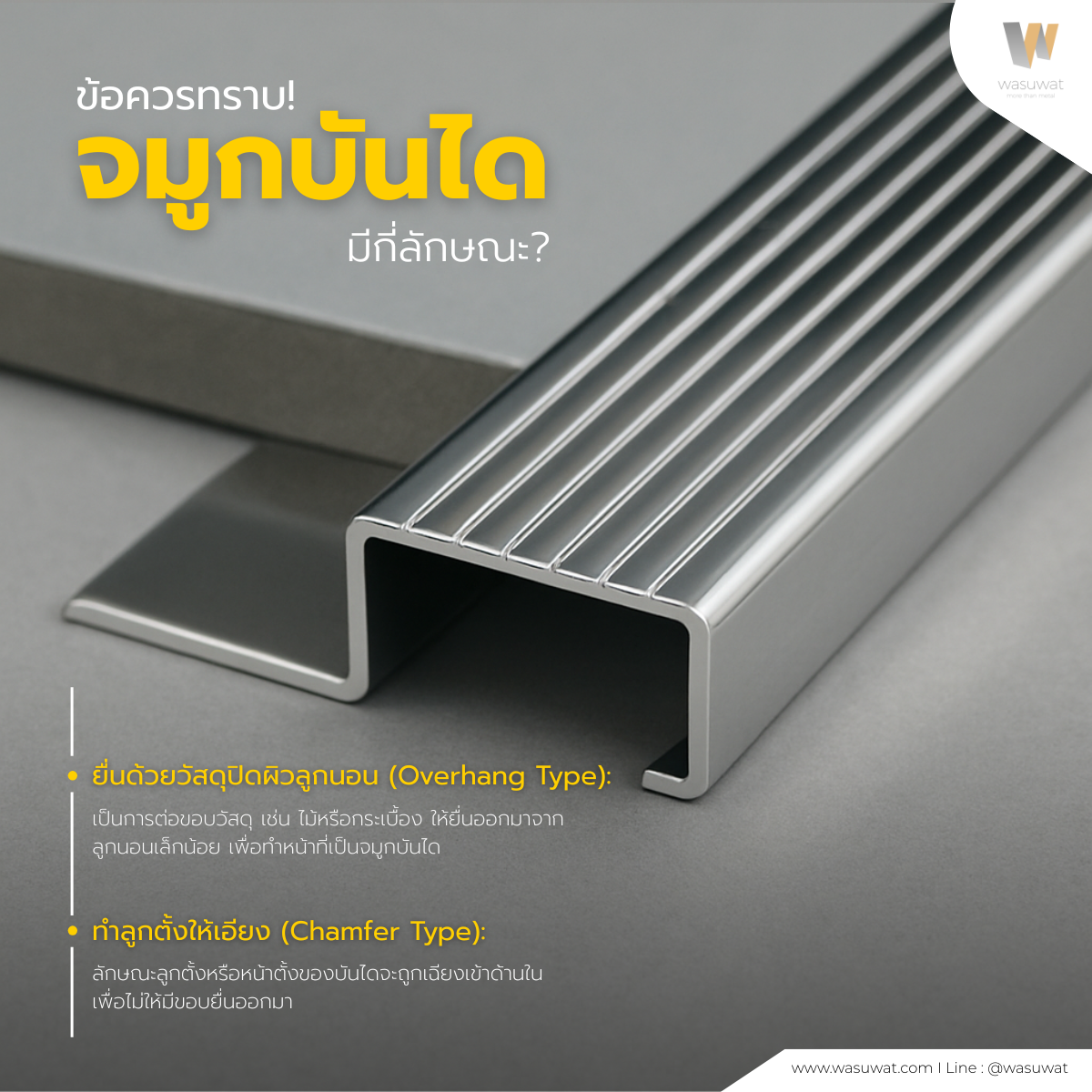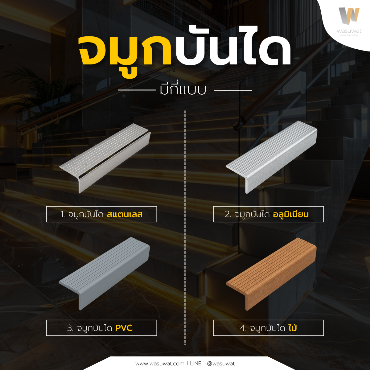 จมูกบันไดเป็นองค์ประกอบสำคัญที่ช่วยเพิ่มความปลอดภัยและความสวยงามให้กับพื้นที่ใช้งาน โดยทั่วไปสามารถแบ่งได้ตามวัสดุออกเป็น 4 ประเภทหลัก ได้แก่ สแตนเลส, PVC, อลูมิเนียม และไม้ ซึ่งแต่ละแบบมีคุณสมบัติเฉพาะตัวที่เหมาะสมกับลักษณะการใช้งานที่แตกต่างกัน ไม่ว่าจะเป็นความทนทาน ความยืดหยุ่น การดูแลรักษา หรือความกลมกลืนในการตกแต่งภายในอาคาร