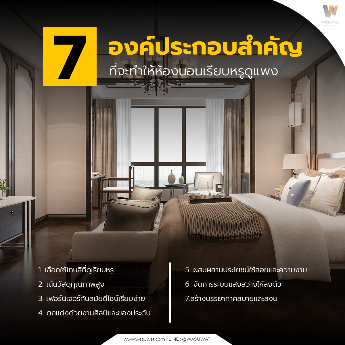 ห้องนอนที่ “เรียบหรู” ไม่ได้แปลว่าต้องแต่งแบบจัดเต็มเสมอไป หากแต่คือการออกแบบที่พิถีพิถันทุกองค์ประกอบ ทั้งสี วัสดุ พื้นผิว ไปจนถึงแสงและเฟอร์นิเจอร์ เพื่อสร้างบรรยากาศที่ผ่อนคลาย สง่างาม และแสดงถึงรสนิยมของเจ้าของห้องอย่างชัดเจน Wasuwat ขอแนะนำ 7 องค์ประกอบหลัก ที่ช่วยให้ห้องนอนของคุณดูเรียบหรูขึ้นได้อย่างมีระดับ