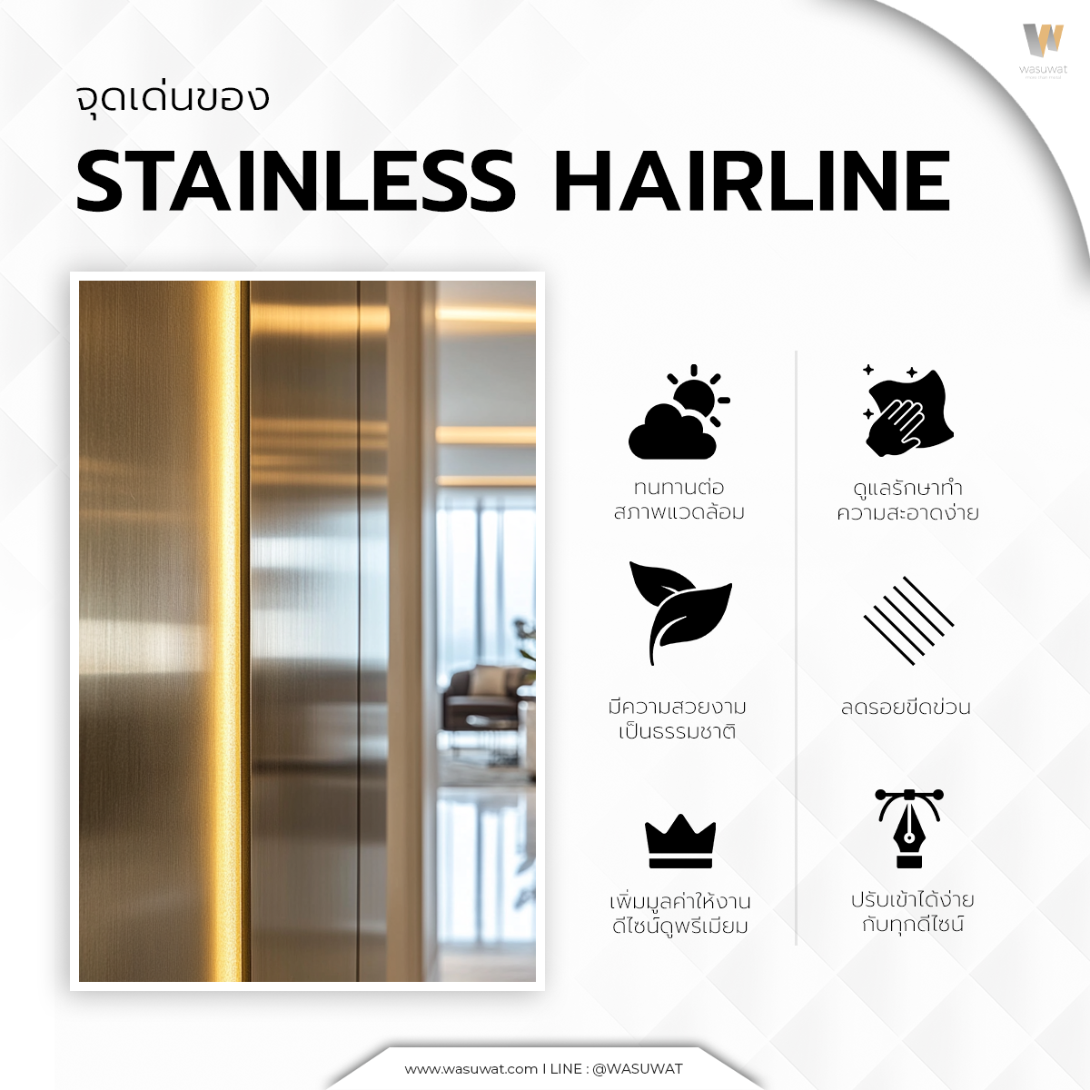 วัสดุตกแต่งที่ทั้งทนทาน ดูดี และดูแลง่ายอย่าง สแตนเลสแฮร์ไลน์ (Stainless Hairline) กำลังได้รับความนิยมมากขึ้นในงานออกแบบภายในทั้งภายในและภายนอก ด้วยคุณสมบัติที่โดดเด่นทั้งเรื่องความทนทาน ความปลอดภัย และรูปลักษณ์ที่สวยงาม บทความนี้จะพาคุณไปรู้จักกับสแตนเลสแฮร์ไลน์ให้มากขึ้น และ Wasuwat ยังแนะนำแนวทางการนำไปใช้งานจริงอย่างสร้างสรรค์