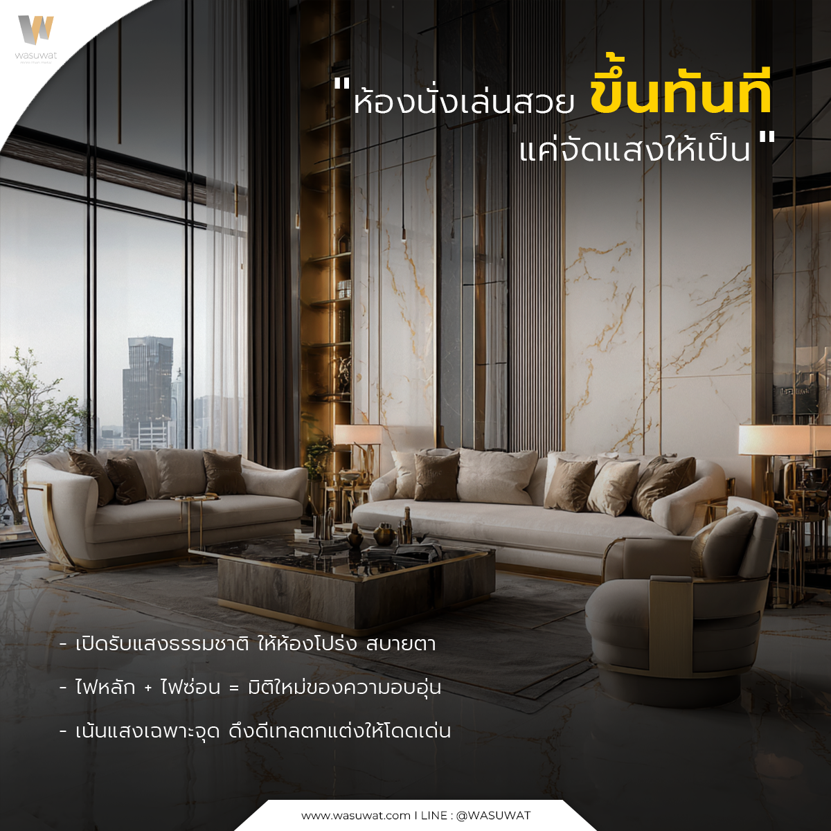 แสงไฟเป็นอีกหนึ่งองค์ประกอบสำคัญที่ช่วยเปลี่ยนห้องนั่งเล่นธรรมดาให้กลายเป็นพื้นที่ที่ดูพรีเมียมและอบอุ่นขึ้นได้ทันที การออกแบบแสงอย่างชาญฉลาดจะช่วยเพิ่มมิติ ความลึก และความมีชีวิตชีวาให้กับพื้นที่