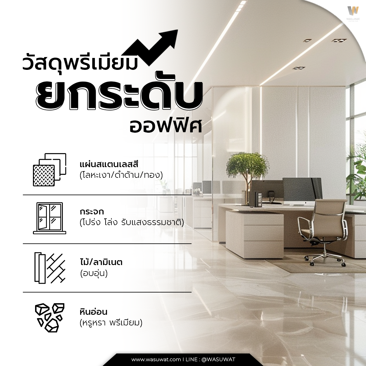 หากคุณกำลังมองหาวัสดุที่ช่วยให้ออฟฟิศของคุณดูพรีเมียมและใช้งานได้จริง Wasuwat คือผู้เชี่ยวชาญที่ตอบโจทย์ที่สุด