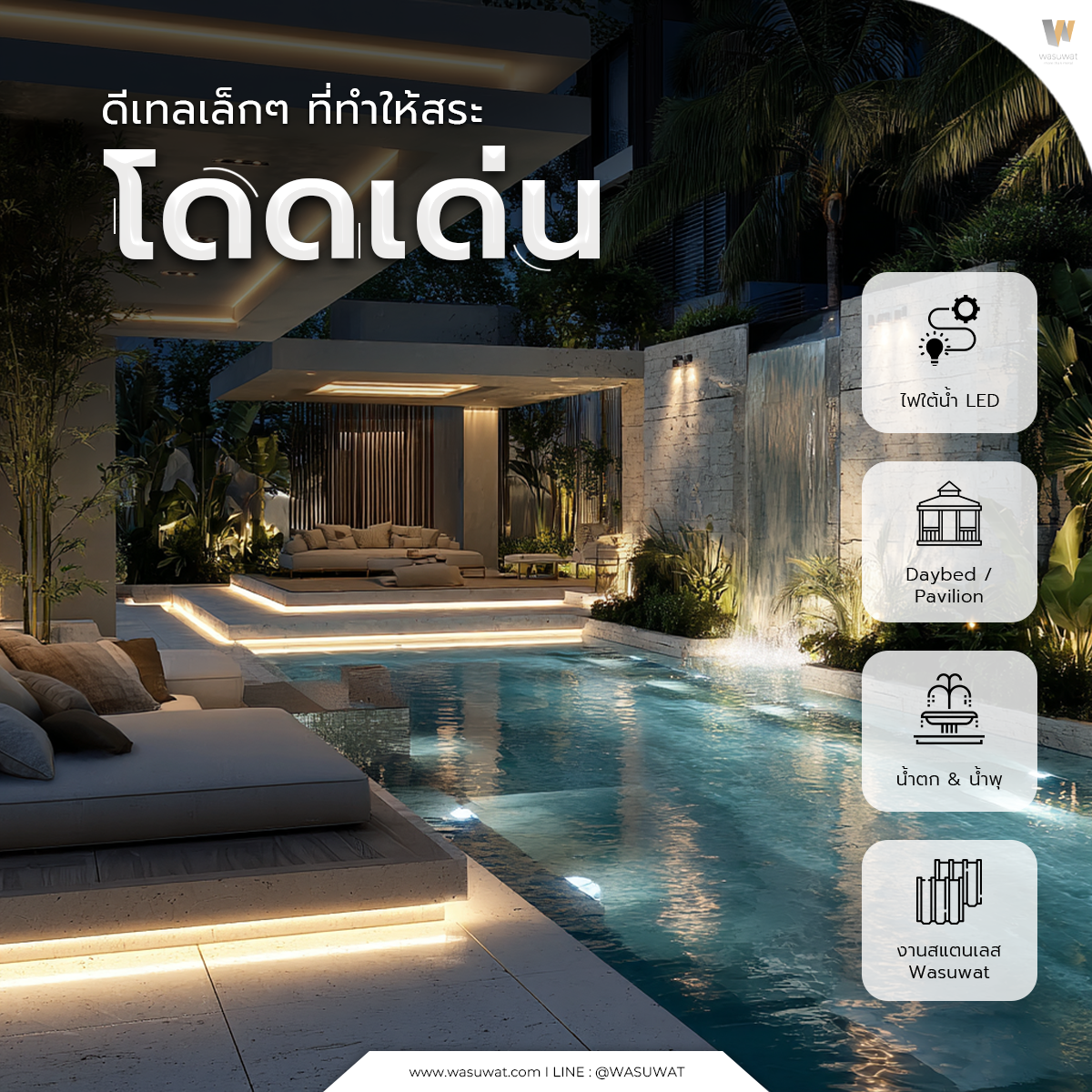 การใส่รายละเอียดเหล่านี้จะทำให้สระว่ายน้ำไม่ได้เป็นเพียงพื้นที่ออกกำลังกาย แต่กลายเป็น จุดศูนย์กลางของบ้านหรือโครงการ ที่เต็มไปด้วยความสวยงามและบรรยากาศที่น่าจดจำ