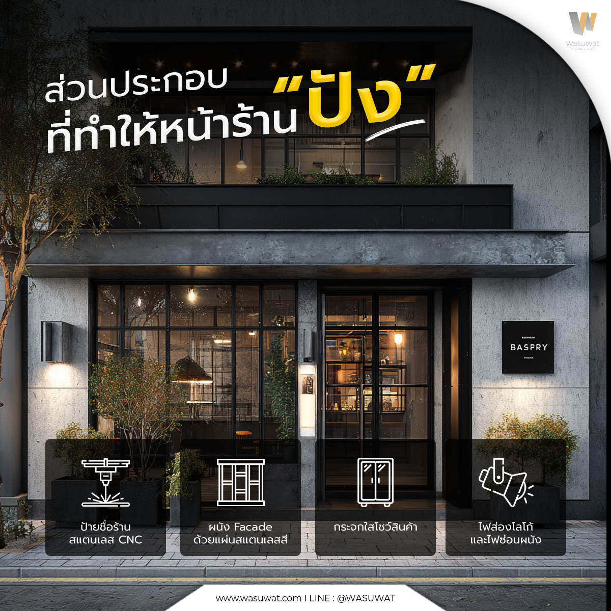 ถือเป็น “จุดแรกที่ลูกค้าเห็น” ควรออกแบบให้ชัดเจน อ่านง่าย และเข้ากับสไตล์ร้าน นิยมใช้วัสดุอย่าง สแตนเลสตัดฉลุ CNC จาก Wasuwat เพื่อความหรูหราและทนแดดฝน - ผนังด้านหน้า (Facade):